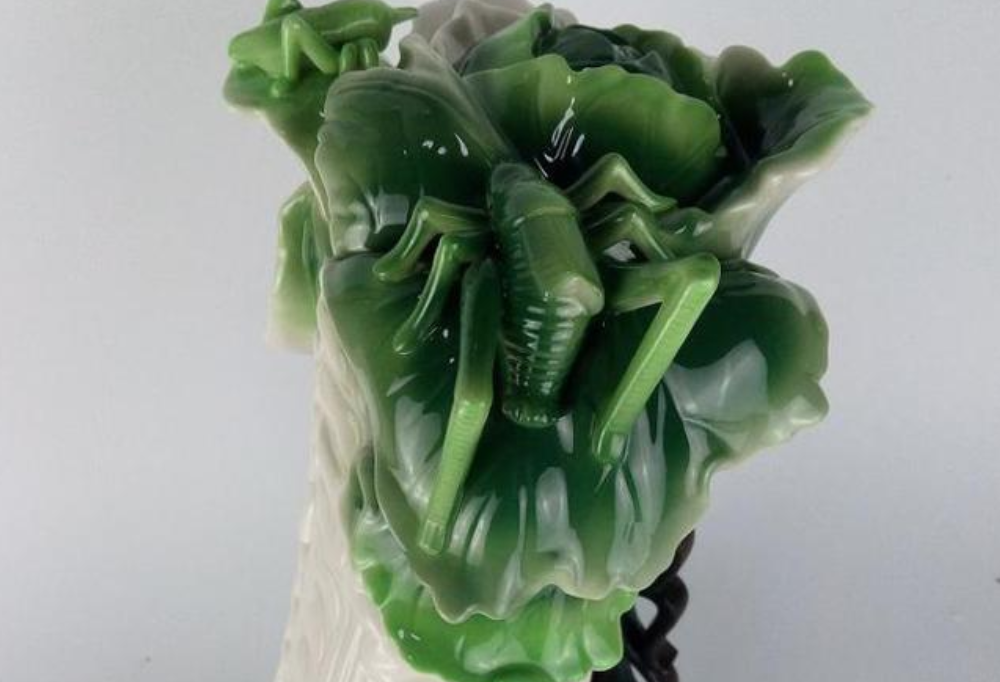 慈禧头枕着的是一个玉西瓜,玉上的纹路好似西瓜表皮,栩栩如生,更为巧妙的是中间有一道红色的缺口,就像西瓜被切去了一角,还能看见西瓜子一般的黑点,使玉西瓜更为逼真。