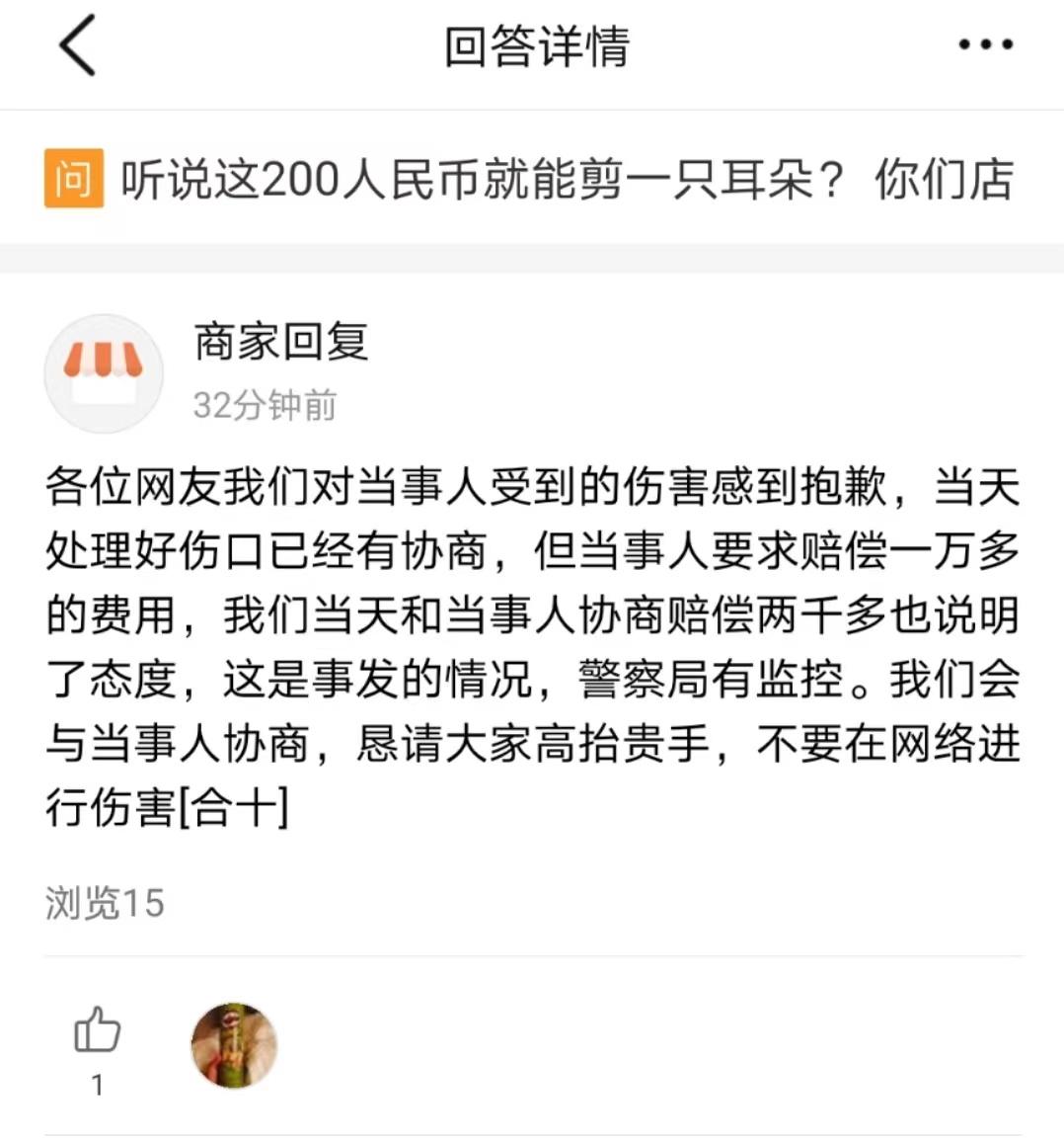 到了医院后,医生表示,陈先生的耳朵无法缝合,只能等待自己愈合,并且可能未来会一直缺一块肉。陈先生询问陪同前去的理发师赔偿事宜,对方无法回应,叫来了门店的一位负责人。