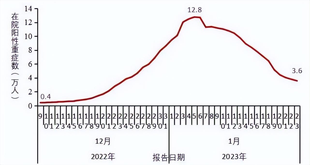 全国在院新冠病毒感染者中,重症患者数量于2022年12月27日至2023年1月3日期间每日增量近1万,1月4日增量明显下降,1月5日达到峰值12.8万,随后持续下降,1月23日下降至3.6万,较峰值下降了72.0%(图3-2)。
