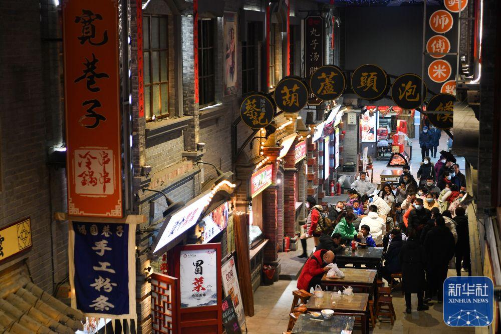 1月24日,市民在位于陕西省咸阳市的福园巷子街区游览,品味特色美食。新华社记者 张博文 摄